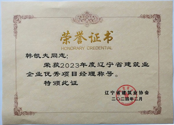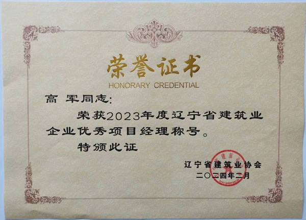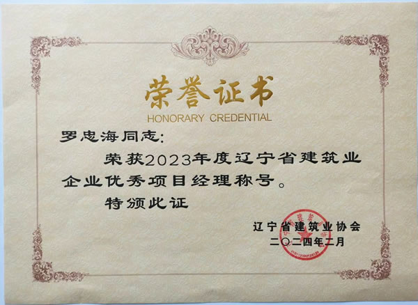 遼寧綏四建設工程集團有限公司的高軍、羅忠海、韓凱夫三名同志被評為2023年度遼寧省建筑業(yè)企業(yè)優(yōu)秀項目經理,并于2024年5月獲得遼寧省建筑業(yè)協(xié)會頒發(fā)的榮譽證書。