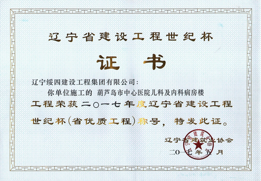 “葫蘆島市中心醫(yī)院兒科及內(nèi)科病房樓”榮獲2017年度遼寧省建設(shè)工程世紀(jì)杯稱號(hào)