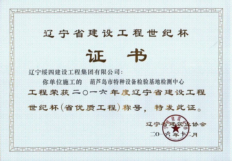 “葫蘆島市特種設備檢驗基地檢測中心”榮獲2016年度遼寧省建設工程世紀杯稱號