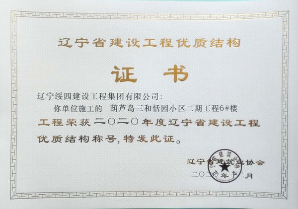 “葫蘆島三和恬園小區(qū)二期工程6#樓”榮獲2020年度遼寧省建設(shè)工程優(yōu)質(zhì)結(jié)構(gòu)稱號(hào)