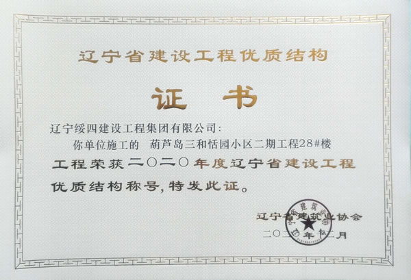 “葫蘆島三和恬園小區(qū)二期工程28#樓”榮獲2020年度遼寧省建設工程優(yōu)質(zhì)結(jié)構稱號
