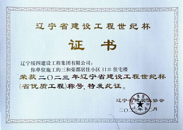 三和榮郡居住小區(qū)11#住宅樓 榮獲2023年遼寧省建設(shè)工程世紀(jì)杯(省優(yōu)質(zhì)工程)稱號