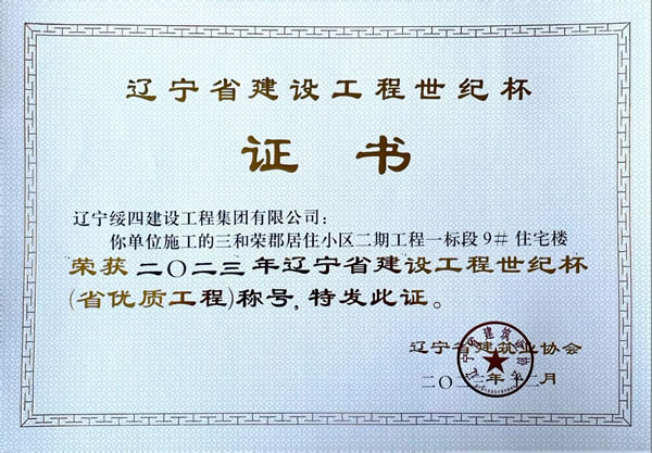三和榮郡居住小區(qū)二期工程一標(biāo)段9#住宅樓 榮獲2023年遼寧省建設(shè)工程世紀(jì)杯(省優(yōu)質(zhì)工程)稱號(hào)